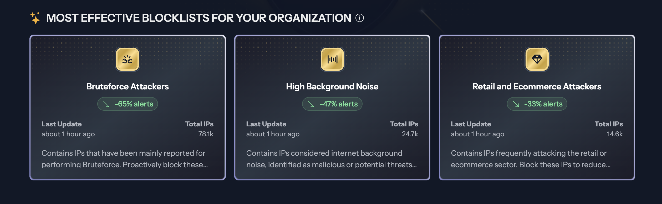 To help gauge the impact of these suggestions, an indicator in the Console shows the potential reduction in alerts you can expect after installing the recommended Blocklists. This allows you to see at a glance how much benefit each suggested Blocklist might provide.