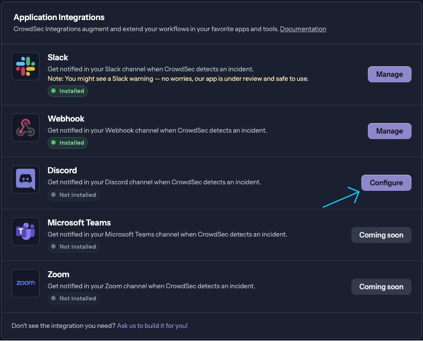 1. In the CrowdSec Console, navigate to Settings > Integrations and then select Configure in the Discord row.