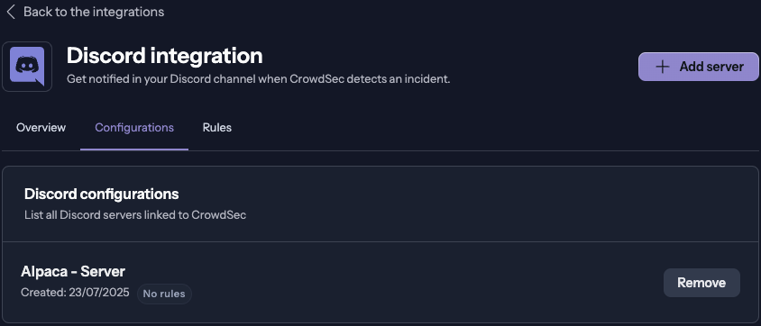 1. In the CrowdSec Console, navigate to Settings > Integrations > Discord go to the Rules tab and click on Add rule.