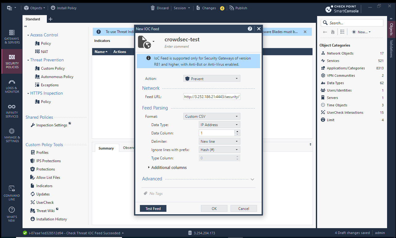 The CrowdSec Checkpoint integration connects CrowdSec's hosted blocklist endpoint to your Checkpoint firewall.